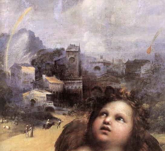 На его дом упал пушечный снаряд во время осады (или молния? или метеорит?), этот загадочный обьект в виде огненного шара мы видим над крышами городских домов на Мадонне Рафаэля.