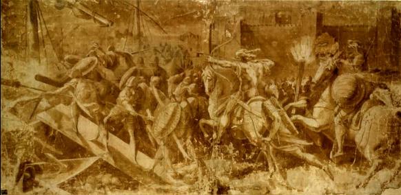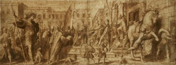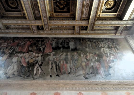 Гонзага всегда с особым вниманием подчеркивали свое благородство, достоинства и военные успехи. Известно, что были работы прославления Династии во Дворцах Мармироло и в Гоито (не сохранились). Три полотна из этих резиденций Гонзага дошли до нас. В Герцогских Дворцах уже были работы Доменико Мороне и фреска в Доме Капитана Луиджи Гонзага приносит клятву народу, Триумфы Цезаря Андреа Мантенья, Триумф Федерико 2 Гонзага и утраченная работа Ночная Битва на реке По в Боргофорте. Подробнее читайте Дворец Капитанов