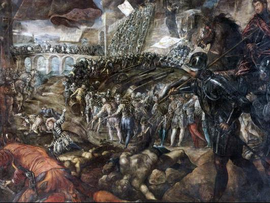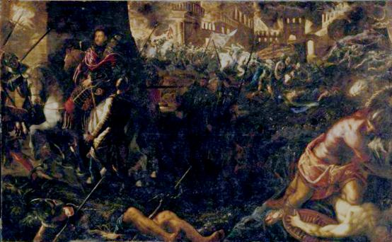В работы для зала Герцогов ему пришлось неоднократно вносить изменения, которые меняли политический оттенок изображения. Много свидетельств этому на Взятии Пармы и Павии (1522 год). Сначала Тинторетто проигнорировал этот сюжет, и Санджованни должен был напомнить о нем.Битва на берегу реки По с артиллерией и пехотой на фоне знаменитого моста.
