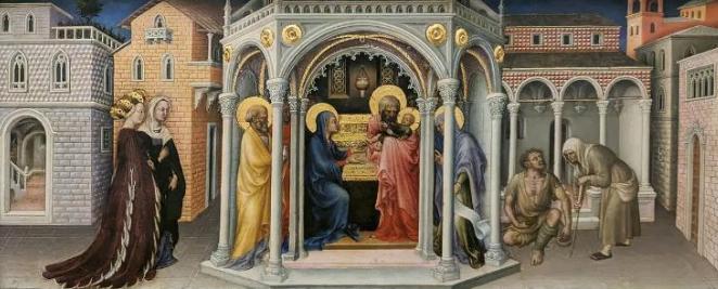 Подобный город мы видим в пределле (нижняя алтарная часть), изображающей Представление в храме, здесь и богатые дамы (жена Палла Строцци Марианна), и нищие, согласно идее, из трактата Аристотеля Политика, ценной копией которого владел Палла Строцци. Хорошее управление городом основывалось на балансе интересов жителей разных слоев общества.