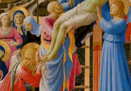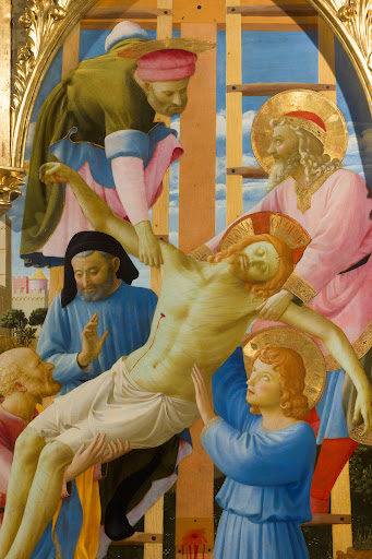Как и Лоренцо Монако для алтаря Бартолини Салимбени, Беато Анжелико написал для Палла Строцци новаторскую сцену: евангельский эпизод занимает все части триптиха, здесь по сравнению с работой Лоренцо Монако меньше золотого фона. Сцена на фоне холмистого пейзажа с видом небесного Иерусалима. Персонажи разделены на три группы, где большое внимание уделяется центральной группе с фигурой Христа с совершенно новой иконографей — его руки удерживаются людьми, которые снимают Иисуса, так что его фигура принимает очертания Креста.