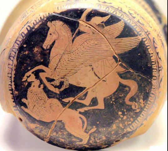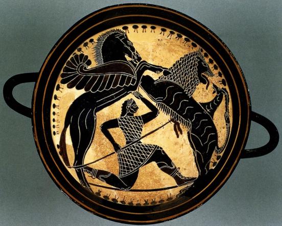 Согласно мифу, Химера была потомком Тайфуна и Ехидны, как и другие чудовищные существа — Лернская Гидра, Цербер и Ортро. Она населяла отвесные горы на побережье Ликии (современной Юго-Западной Турции) и терроризировала население. Царь Иобат, устав от этих постоянных набегов, призвал греческого героя Беллерофонта убить зверя: сыну Посейдона удалось победить с помощью крылатого коня Пегаса и с помощью уловки,- бросив в рот свинцовое копье, которое расплавилось от пламени, извергаемого химерой, и задушило ее.