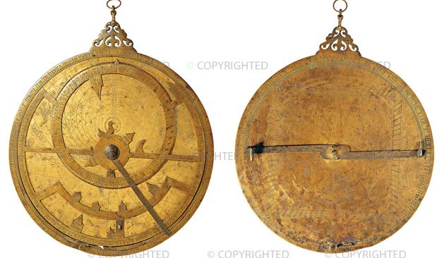 Астролябия — это сложный астрономический инструмент в виде лимб, с нанесенными шкалами и кругами, подвижной сетки (паук), изображающей звезды, и указателя (алидада) для измерения высот небесных тел. Позволяла решать задачи определения времени, положения звезд и навигации, представляя собой по сути аналоговый компьютер небесной механики.