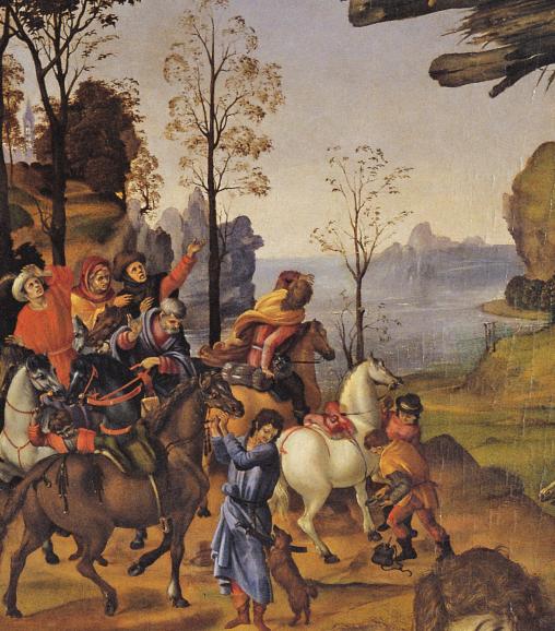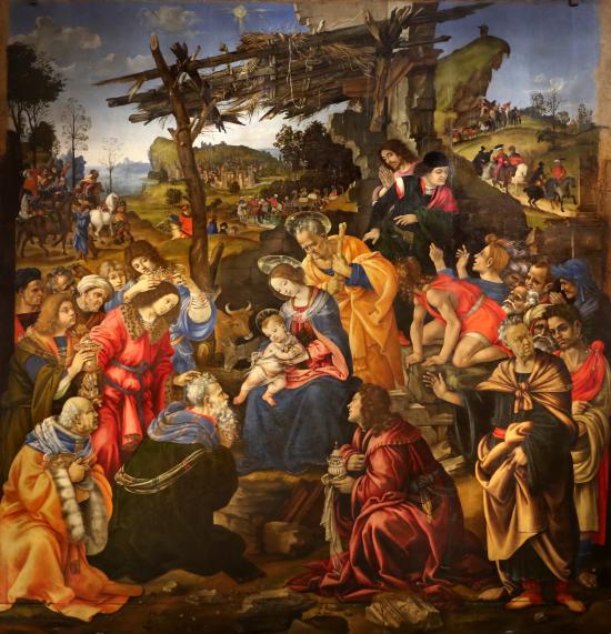 В Поклонении волхвов мы видим гениальное решение Филиппино: изображение Пьерфранческо Медичи в роли астролога, четко на переднем плане и ближе к зрителю, чем сыновья Джованни и Лоренцо, и дальше от младенца Иисуса. Сын Джованни ди Пьерфранческо (дед герцога Козимо, покровителя Вазари) под видом пажа, стоит за астрологом и предлагает украшенную чашу своему старшему брату Лоренцо ди Пьерфранческо.