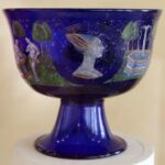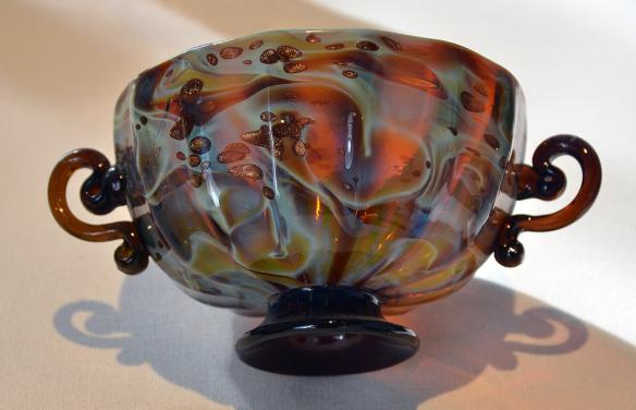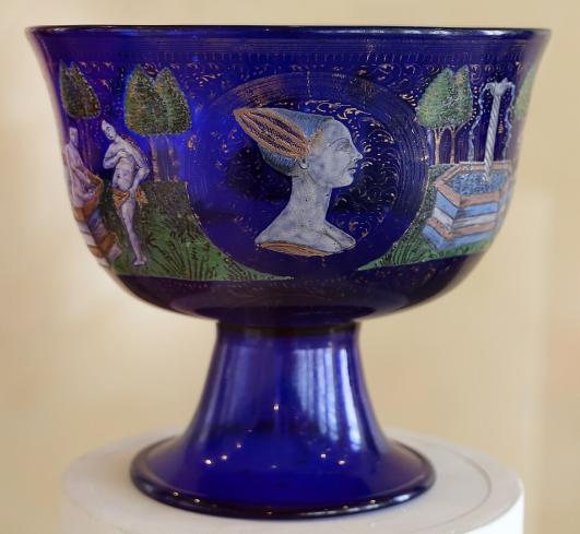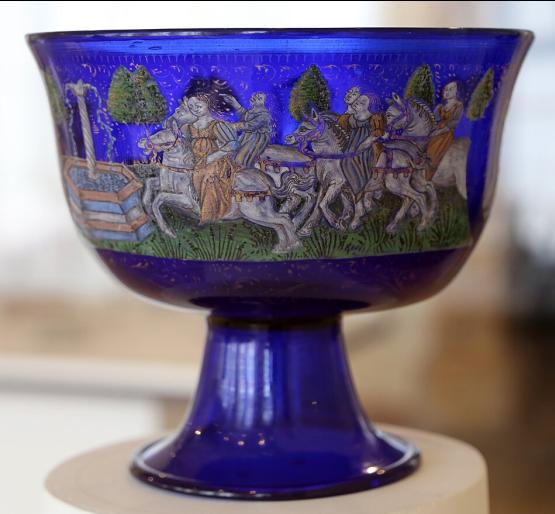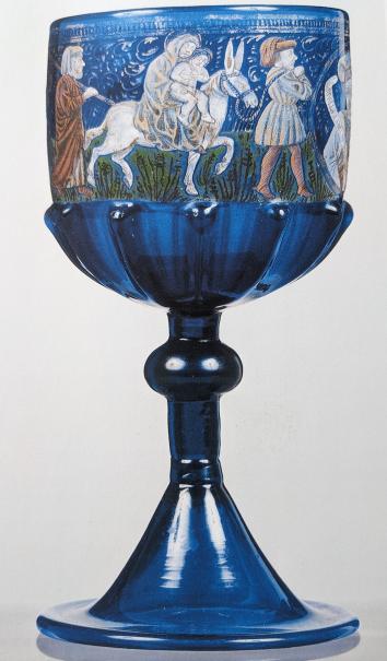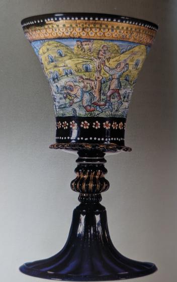 Иногда ножку делали разной техникой, а стены бокала оставляли ровными для рисунка эмалью. Прекрасный кубок в Музее Кливленда, работа венецианских мастеров 15 века — синяя ножка, узоры в виде жемчужин, листочков и чешуи в основании чаши. На стенках бокала сценка с фигурами – торговец заснул, и его оргабили обезьяны. Проснувшись, он пытается отнять бусы у обезьян.