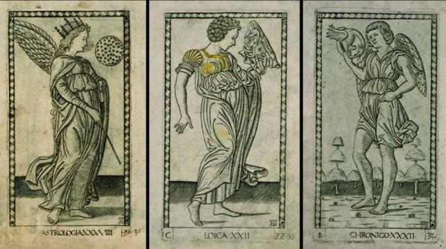 Здесь же три грации, купальщик и купидон с завязанными глазами пускает стрелу. Для такой сценки предложена интерпретация: пьянство (заснувший купец), тщеславие (обезьяны) и похоть (обнаженные женщины и купидон). Для этой группы декоратор использовал известную тогда модель – так называемые карты “Таро Мантенья”. Их считают работой феррарских мастеров около 1465 года, подробнее читайте в статье Не таро и не Мантенья.