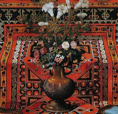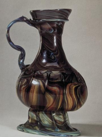 Характерным композиционным приёмом венецианских изделий является контраст простой по форме верхней части кубка или вазы с усложнённым основанием. Требовалась сложная работа с двойным слоем стекла, чтобы добиться округлой выпуклой и изогнутой формы внизу. На работе Гирландайо подобная ваза кажется сделанной из камня, но это халцедоновое стекло, здесь как раз основание из двойного слоя с волнистой границей. Халцедонское стекло, похожее на камень, не могло не понравиться во Флоренции, где работали с камнями. Многие тосканские художники изображают изделия из такого стекла. Если кувшин в Британском музее представить без ручки, то увидим вазу Гирландайо.